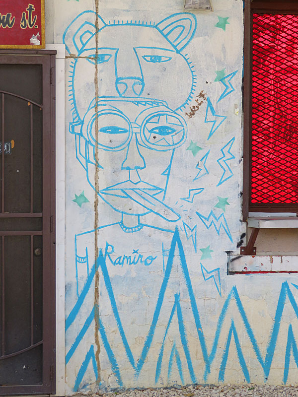 The building at 103 West Grayson Street has a chain-link fence around it. One of the murals, which includes a portrait of former owner Ram Ayala, has graffiti painted on it.