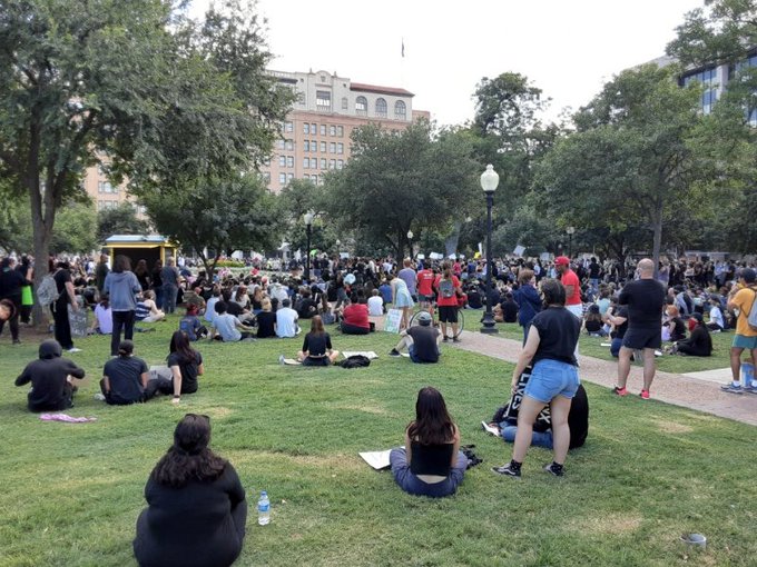 Demonstraters pray together at a Black Lives Matter protest in Travis Park in San Antonio the week after the death of George Floyd.