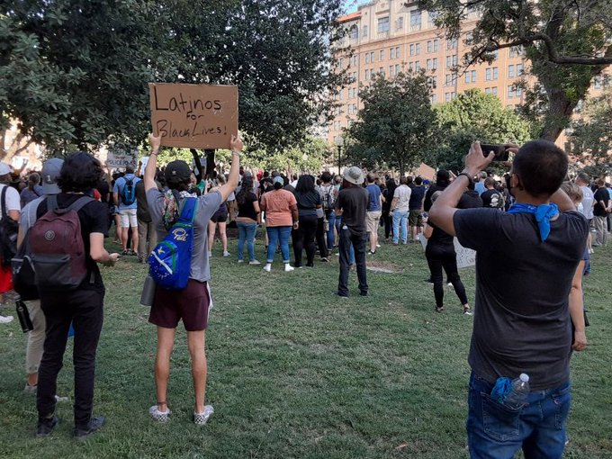 “Latinos For Black Lives” sign at a Black Lives Matter protest in Travis Park in San Antonio the week after the death of George Floyd.